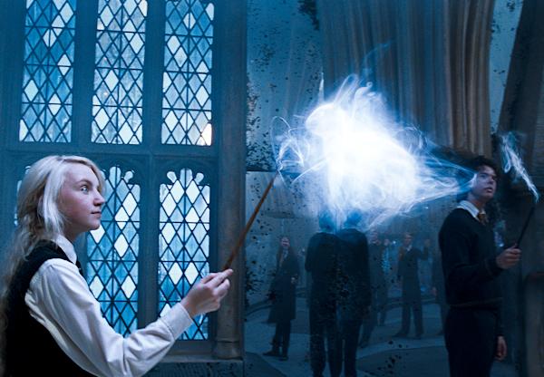 The Patronus Charm is a defensive spell that, if performed correctly, conjures a silvery animal form particular to the user. The charm is used to defend against Dementors - where the witch or wizard summons a guardian to shield them. The Patronus is formed of hope and happiness, so that the Dementor feeds on it rather than the caster. In order to cast the spell, it is necessary first to think of a happy memory and then use the incantation, ‘Expecto Patronum’. Used famously by Harry Potter in order to save a future version of himself from Dementors whilst using a Time-Turner, each witch or wizard’s Patronus holds meaning for them, resembling part of their character or occasionally in homage to a loved one. While a corporeal Patronus was strongest, non-corporeal forms could be slightly effective. Corporeal animal form Patronuses can also be used to deliver messages, speaking in the caster's voice.